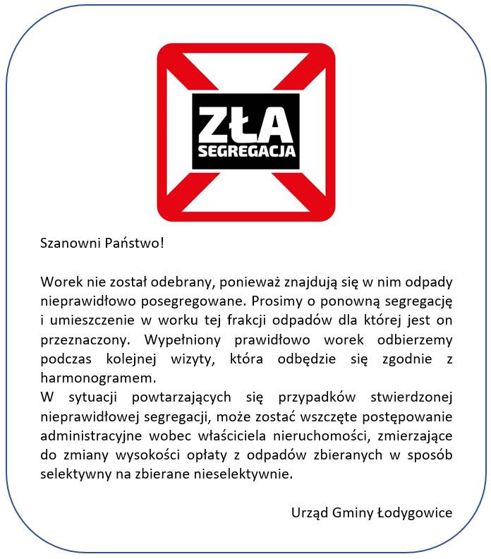 W tym celu pracownicy firmy Eco Team Service przy stwierdzeniu nieodpowiedniej segregacji nie odbiorą odpadów i zostawią naklejkę "Zła segregacja". W przypadku notorycznego powtarzania się tej sytuacji w poszczególnych gospodarstwach domowych, zostanie zmieniona stawka opłaty za wywóz śmieci.
