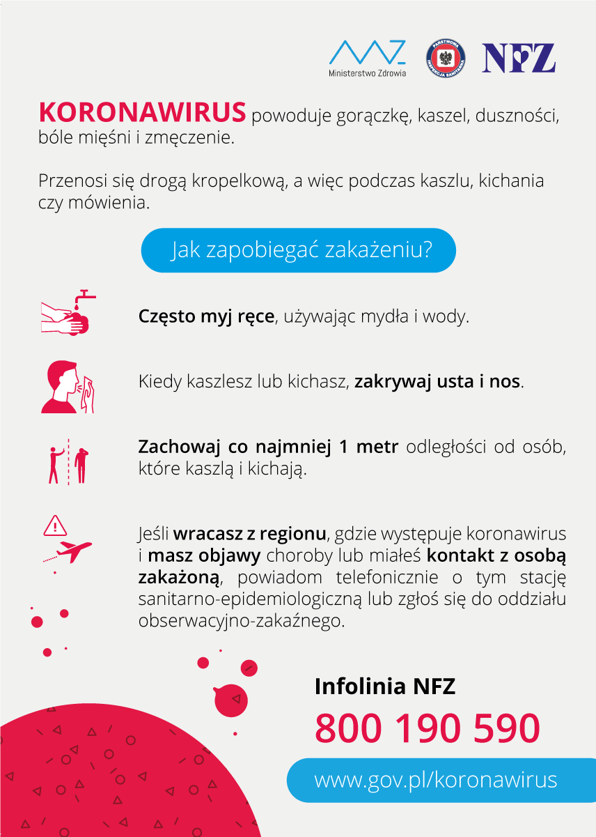 W pociągach zostaną umieszczone również informacje dla pasażerów dotyczące objawów, unikania zakażenia oraz kontaktu do Państwowej Inspekcji Sanitarnej.