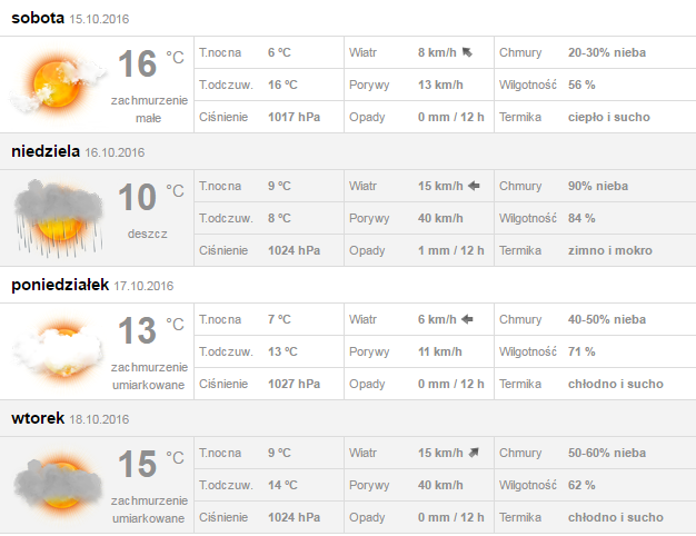 Niedziela: Pogoda się trochę pogorszy, znowu się zachmurzy, temperatura spadnie do 9-11*C. Niewykluczone są przelotne opady deszczu.