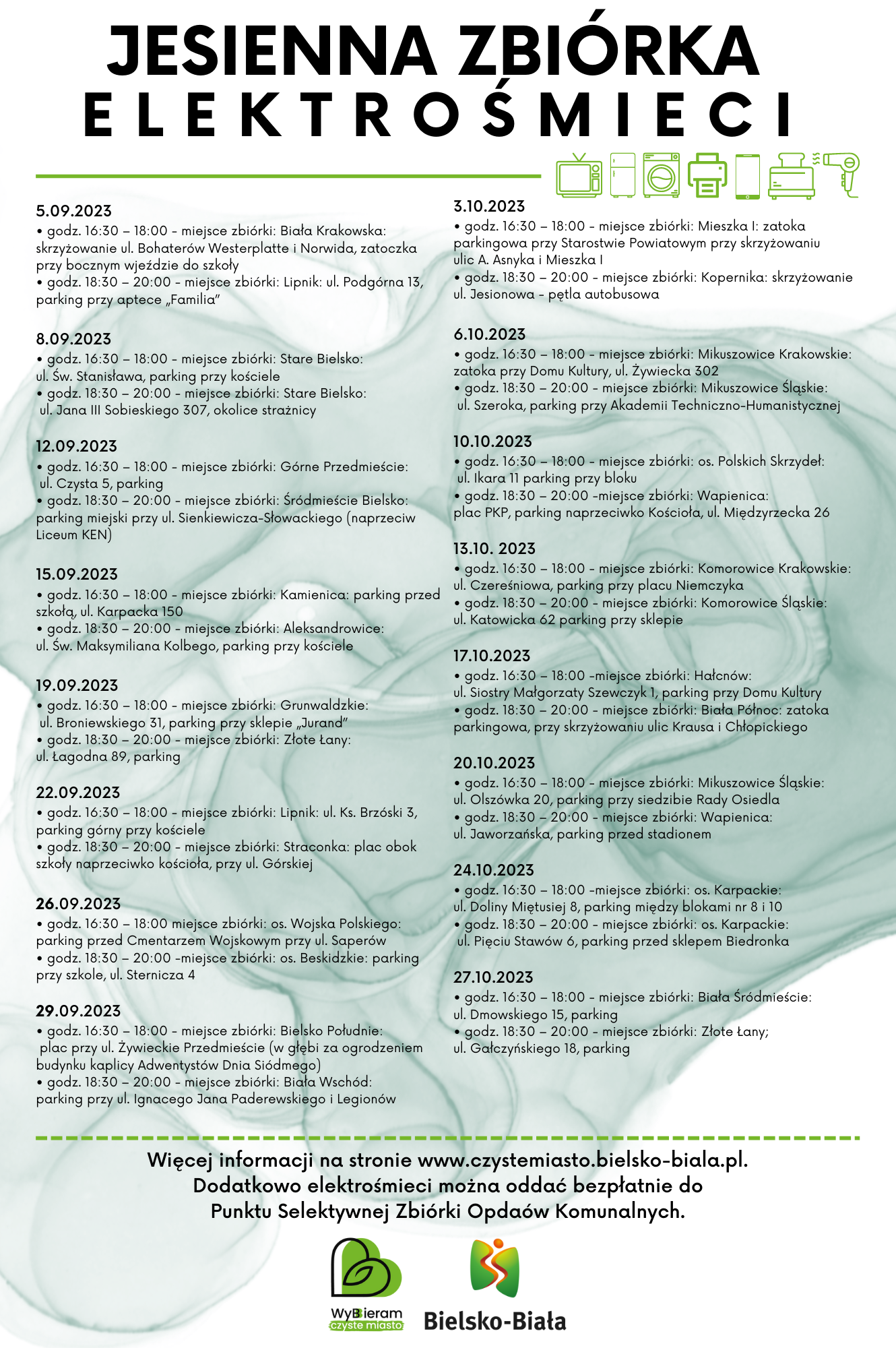 Akcja potrwa do 27 października. W tym czasie elektroodpady będą odbierane w 32 lokalizacjach, według poniższego harmonogramu.