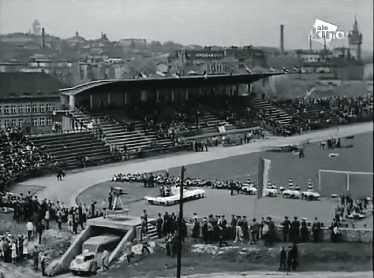Wyścig kolarski na stadionie BKS Stal. Kadr w filmu „Zawsze w niedzielę”, rok 1965.