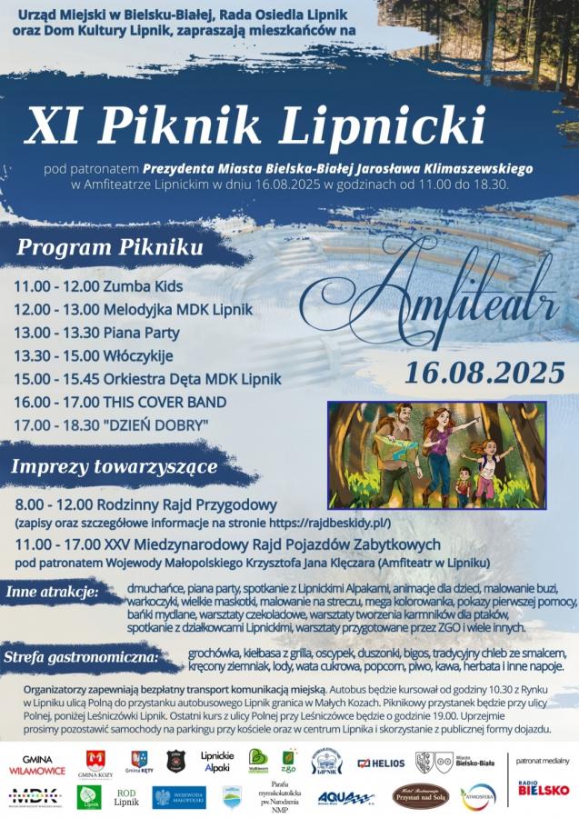 Amfiteatr w Lipniku 16 sierpnia zamieni się w arenę 11. Pikniku Lipnickiego, organizowanego przez Urząd Miejski w Bielsku-Białej, Radę Osiedla Lipnik oraz Dom Kultury w Lipniku pod patronatem prezydenta miasta Jarosława Klimaszewskiego. Wydarzenie obejmie bogaty program artystyczny i muzyczny, Rodzinny Rajd Przygodowy, Międzynarodowy Rajd Pojazdów Zabytkowych, edukacyjne stoisko o odpadach, atrakcje dla dzieci i strefę gastronomiczną. Bezpłatny transport komunikacją miejską jest zapewniony dla uczestników.